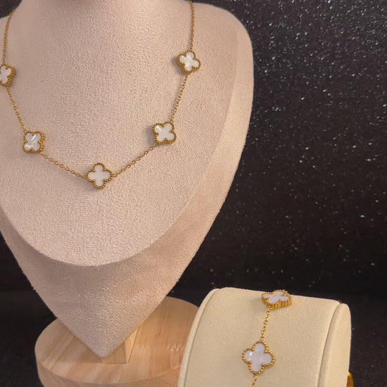 Hecho en acero inoxidable, con tréboles blancos que aportan un toque de lujo y estilo.