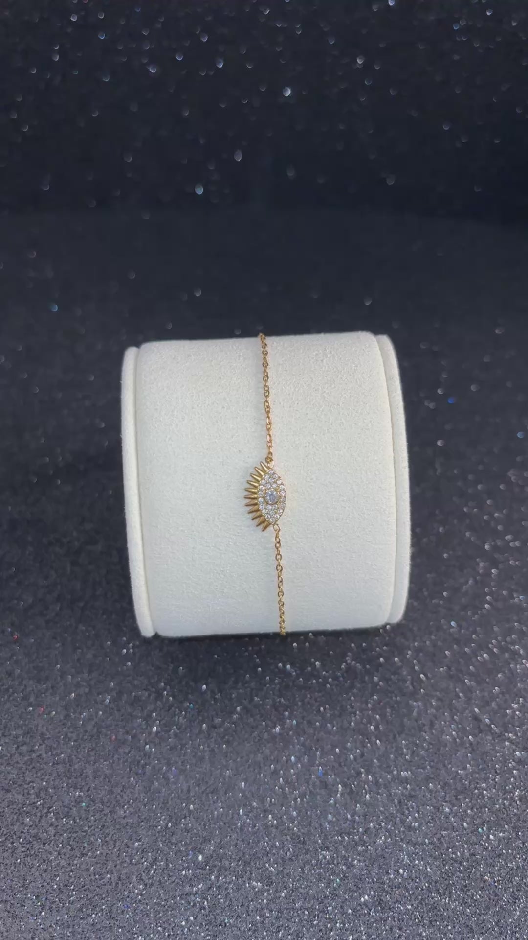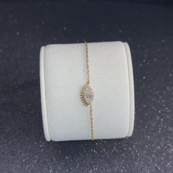 Una pulsera dorada con el clásico ojo protector rodeado de circonitas. Un diseño moderno que combina estilo y simbolismo, perfecto para quienes buscan un accesorio elegante con un toque espiritual. No cambia de color y mantiene su brillo.